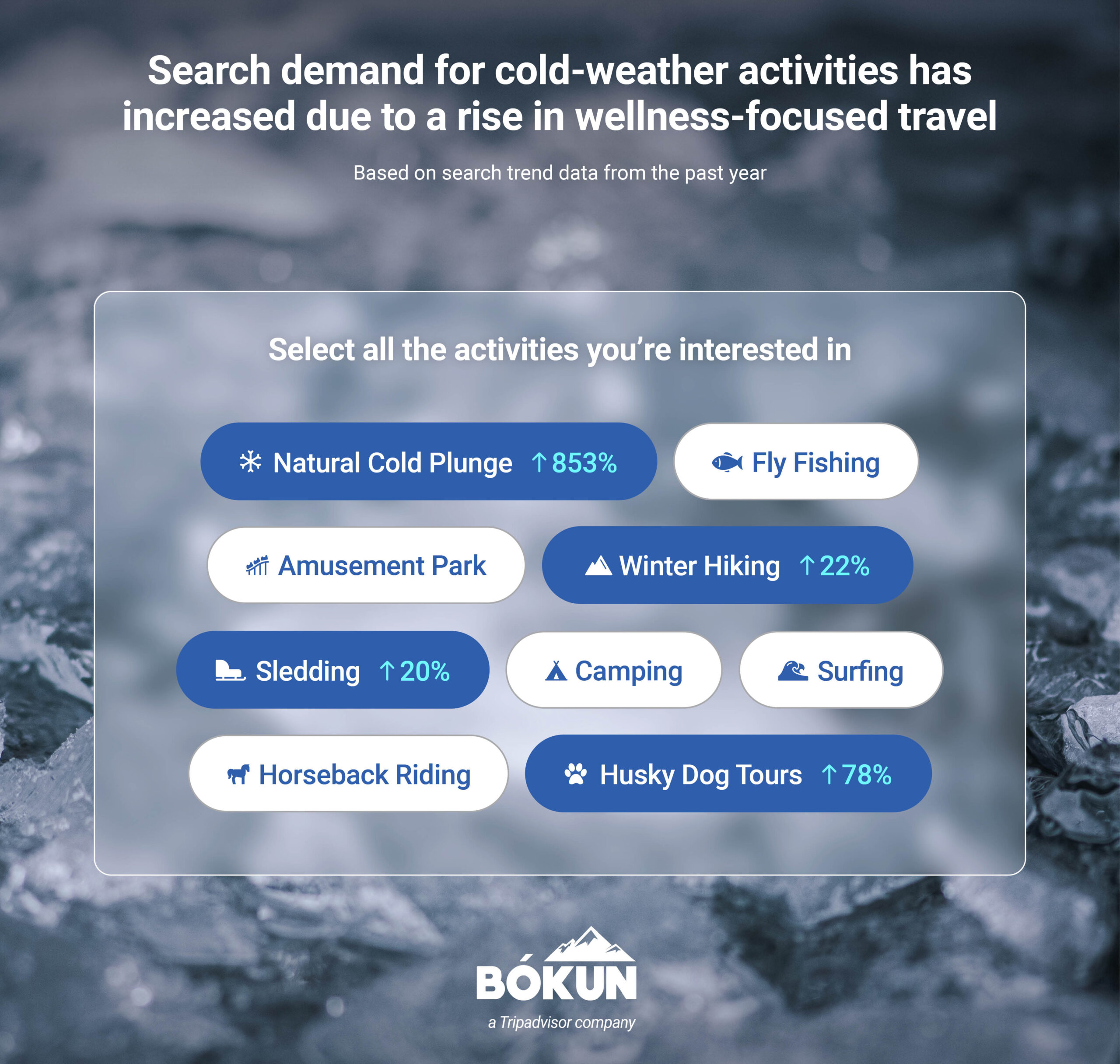 Search demand for particular cold activities was collected from Google trends over the past year. To identify the countries with the best offerings for each activity, data for each cold activity was gathered from Tripadvisor and organised by country and city to determine which locations provided the highest number of experiences for consumers.