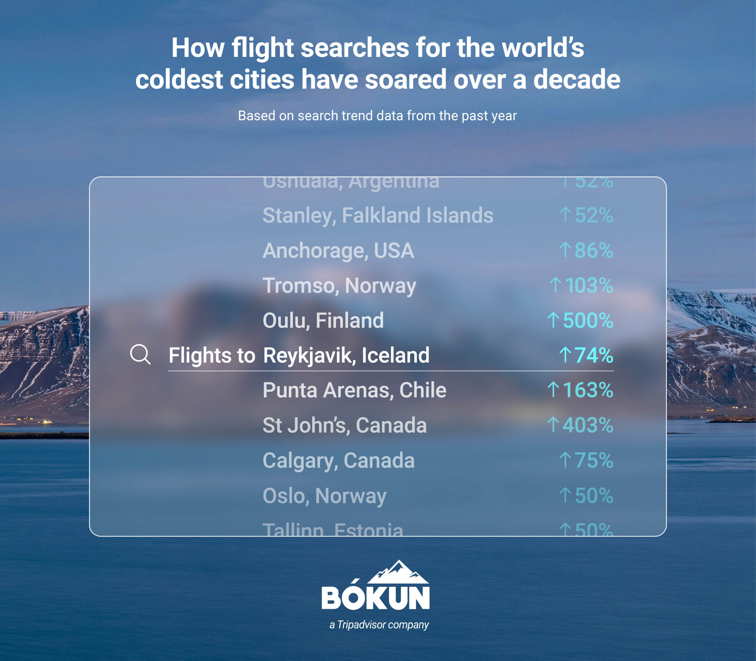 Other notable cities inside the top 20 were Tromso in Norway (+103%), Calgary in Canada (+75%), Reykjavik in Iceland (+74%) and Tallinn in Estonia (29%).