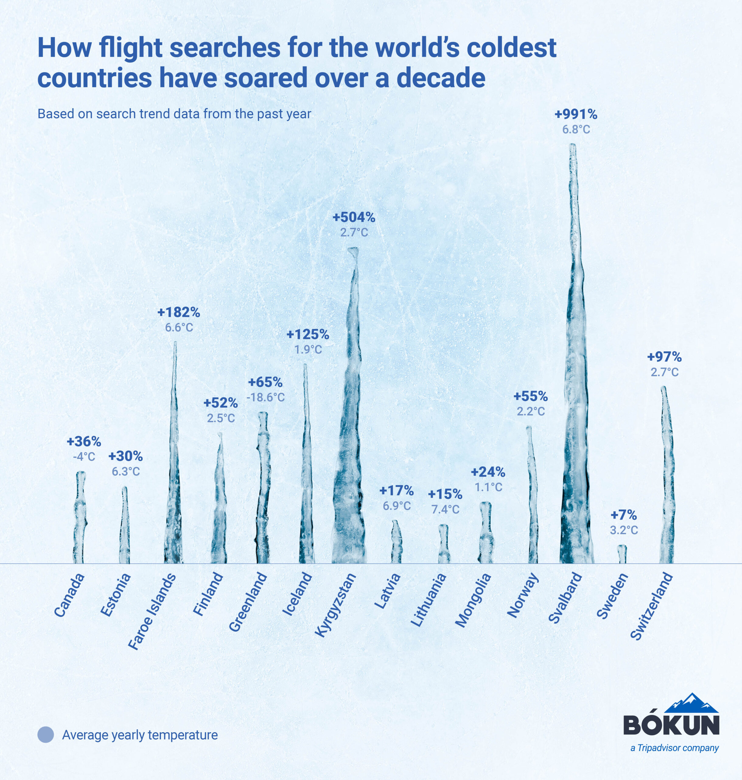 We analysed search demand for “flights” to the 14 coldest countries worldwide to reveal how consumer demand has changed over the past decade.
